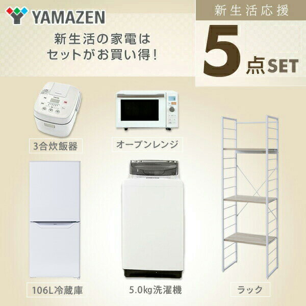 【新生活応援セット】 家電セット 一人暮らし 新生活家電 5点セット 新品 (106L冷蔵庫 5.0kg洗濯機 家電収納ラック オーブンレンジ 炊飯器)1人暮らし 単身赴任 オフィス 事務所 引越し 引越し 出張 寮 シンプル 山善 YAMAZEN 【送料無料】